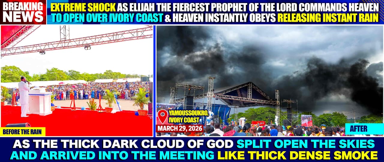 Taaskord olime 29.3.2026 Ivory Coasti Tervendamisteenistusel tunnistamas väga suurt ime. Piibellik ime, Piibli ime kordus. See on 30. kord, kui ISSANDA Püha Prohvet Dr OWUOR käskis taeval avaneda ja tuua vihm … ning taevas kuuletus. Ta räägib JUMALAGA kõigi kuuldes ja JAHVE vastab talle koheselt! Tema teeb seda rahvusvaheliste live-kaamerate ees päikesepaistelisel suvepäeval. Kui ilmajaam ütleb, et täna vihma ei saja, siis Karmeli mäe prohvet Eelija käsib taeval avaneda ning vihm hakkab koheselt sadama.